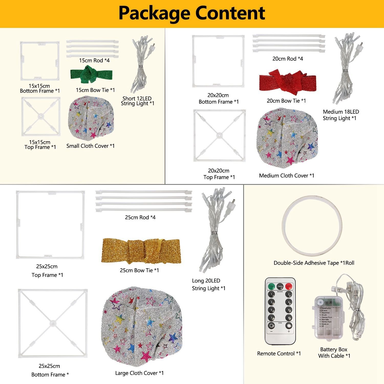 *Easy Setup & Stacking Design*:Simply connect all rods,cover with the shade,attach the ribbon and bow,connect the light string together,and put into 3Pcs AA batteries(Not Included) for usage. When not in use,just put the small box and medium box into the large box for quick and space-saving storage.